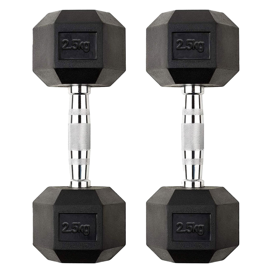 Pair of 2.5kg Hex Dumbbells – Rubber Coated Cast Iron with Chrome Knurled Handles – Compact Anti Roll Free Weights for Home Fitness & Strength Training