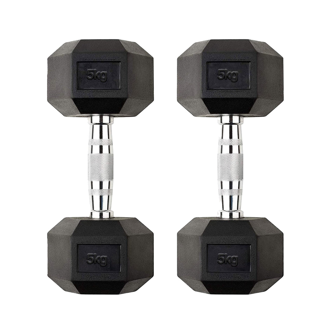 Set of 5kg Hex Dumbbells – Rubber Coated Cast Iron with Chrome Knurled Handles – Compact Anti Roll Weights for Strength Training at Home Gym UK